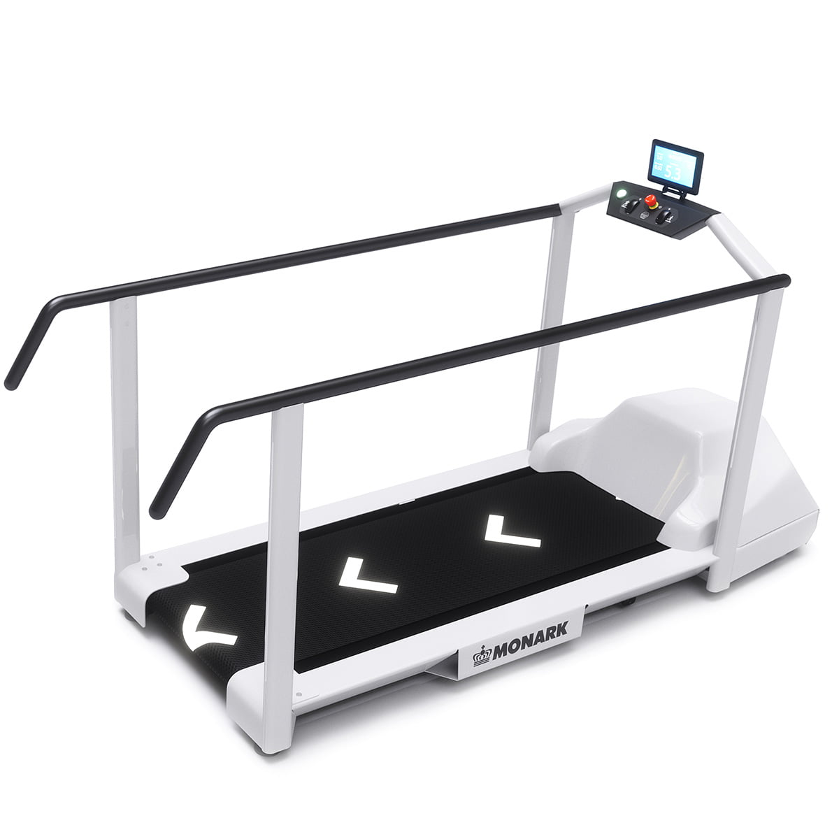 Monark Medical Löpband är utformat för test- och rehabiliteringsändamål. Löpbandet har låg starthastighet (0.1 km/h), ett lågt insteg, tydliga knappar och är utrustat med långa räcken som sträcker sig utanför löpbandets yta för att ge bästa tillgänglighet och användarförutsättningar.