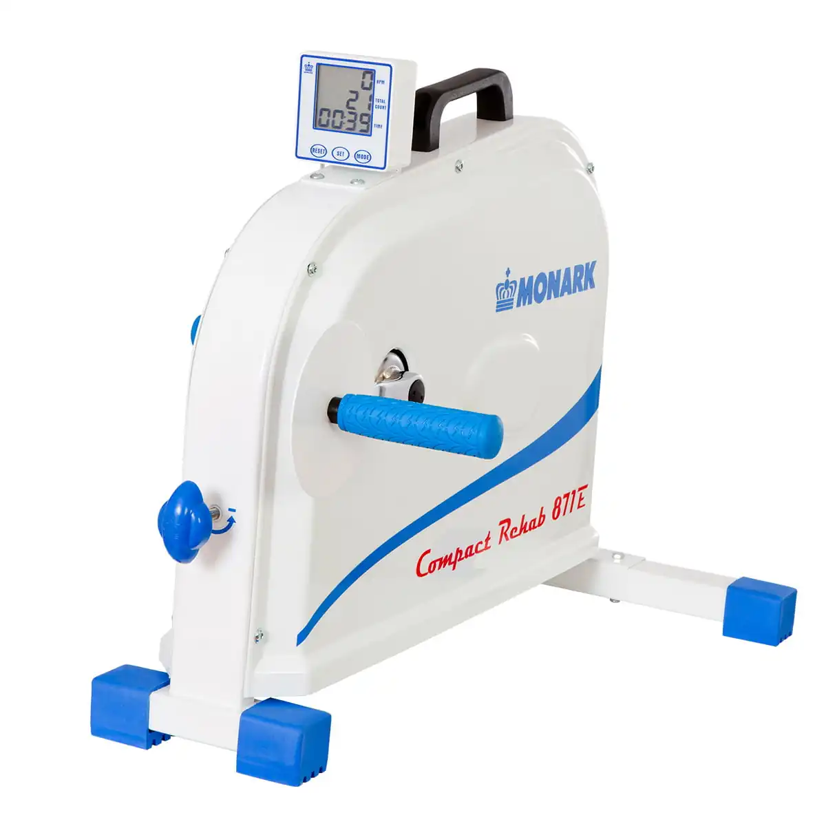 Monark Compact Rehab 871 E är en liten och behändig arm- och bencykel som är lättanvänd och har en jämn och skön gång. Idealisk för uppvärmning och träning på sjukhus och rehabiliteringscenter, sittande eller stående. Bra val för rehabilitering.